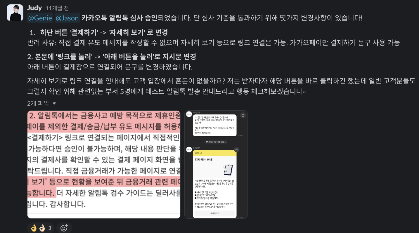 고객에게 제공해야할 정보를 고르고, 카카오톡 검수 가이드라인을 바탕으로 시안 작업 후 심사를 신청했다.