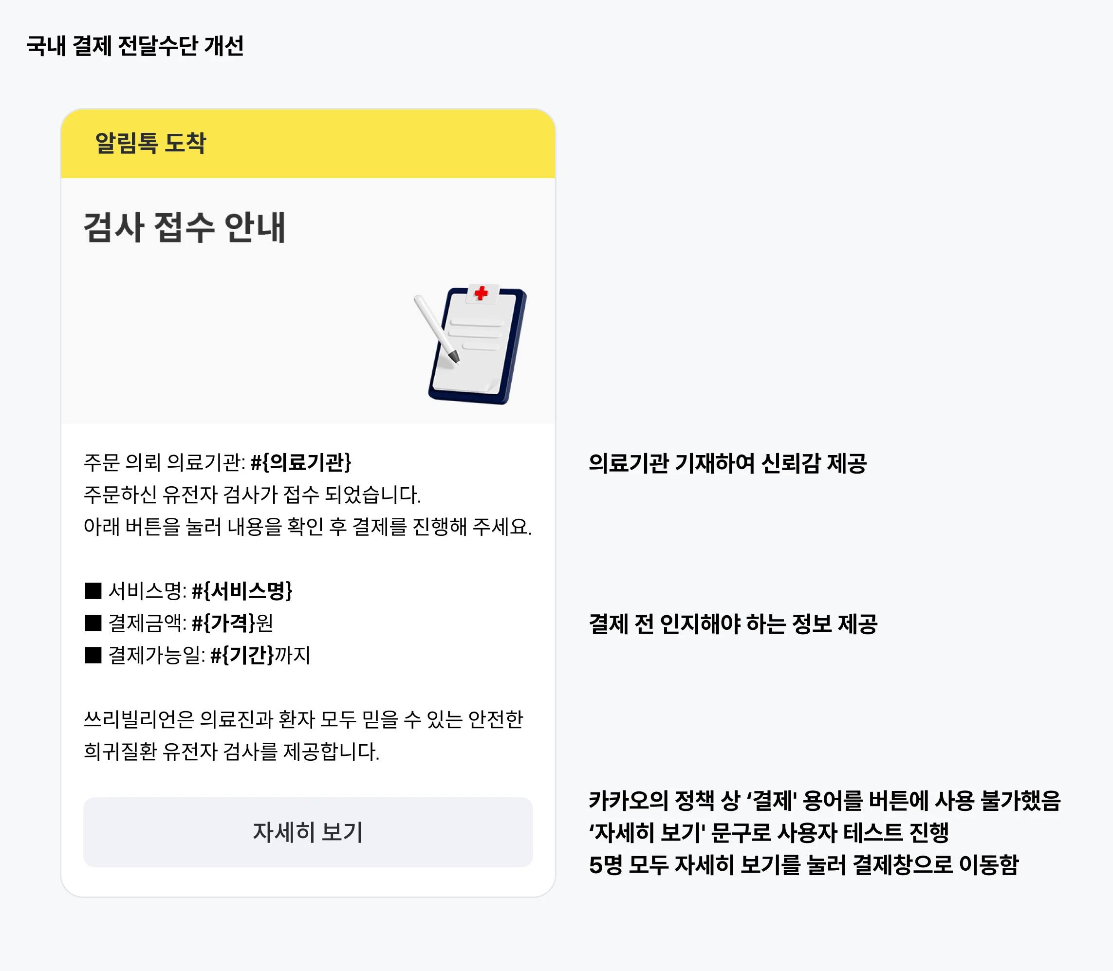 심사 과정에서 알게된 사실이 하나 있는데, 불법적인 결제 유도를 막기 위해 카카오페이를 제외한 타 결제 모듈로 이동 시에는 하단 버튼에 '결제하기'라는 용어를 사용할 수 없는 것이었다. 당연히 '결제하기'로 CTA 문구를 생각했었는데... 고민하다가 일반적으로 쓰이는 '자세히 보기'로 변경하였다. 그리고나서 프로젝트와 관련 없는 직원 5명을 대상으로 UT를 진행했다.