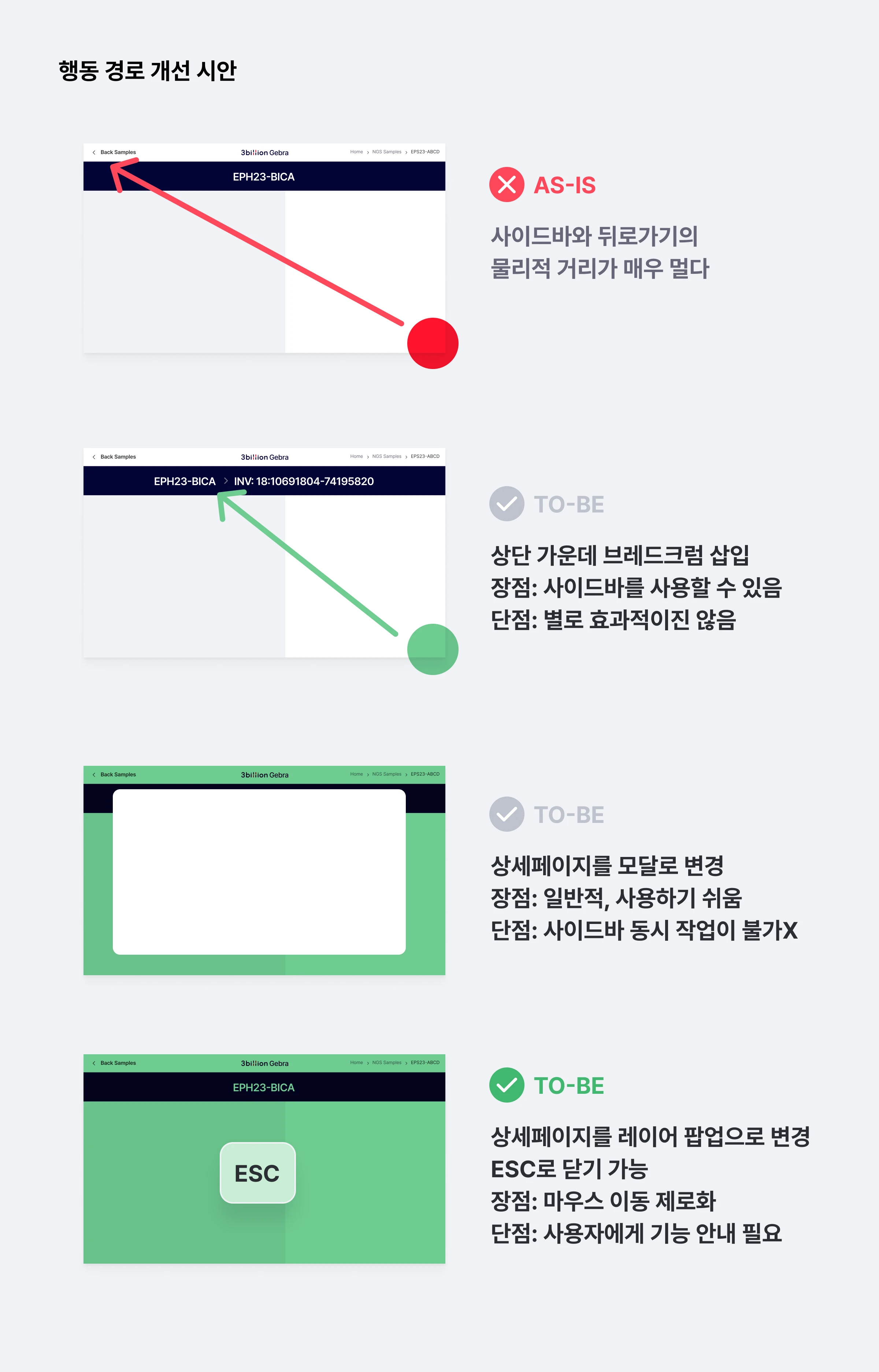분석 페이지에서 상세 페이지로 이동하는 인터렉션을 '들어가기 - 뒤로가기'로 설계하여, 일반적으로 뒤로가기 기능이 위치하는 좌측 상단에 해당 버튼을 두었다. 만약 이 이동 방식이 '들어가기 - 뒤로가기' 가 아니라, '레이어 켜기 - 레이어 끄기' 라면? See details이라는 버튼으로 레이어를 '켜고' ESC(또는 Close 버튼)으로 마우스 위치에 관계 없이 레이어를 '끄는' 동작에 개연성이 생기는 것이다.