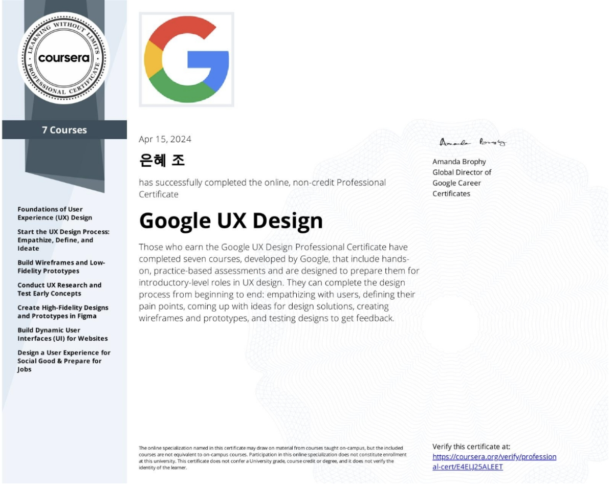 Google UX Design - 전문 인증서의 마지막 코스인 Design a User Experience for Social Good & Prepare for Jobs를 수료했다.