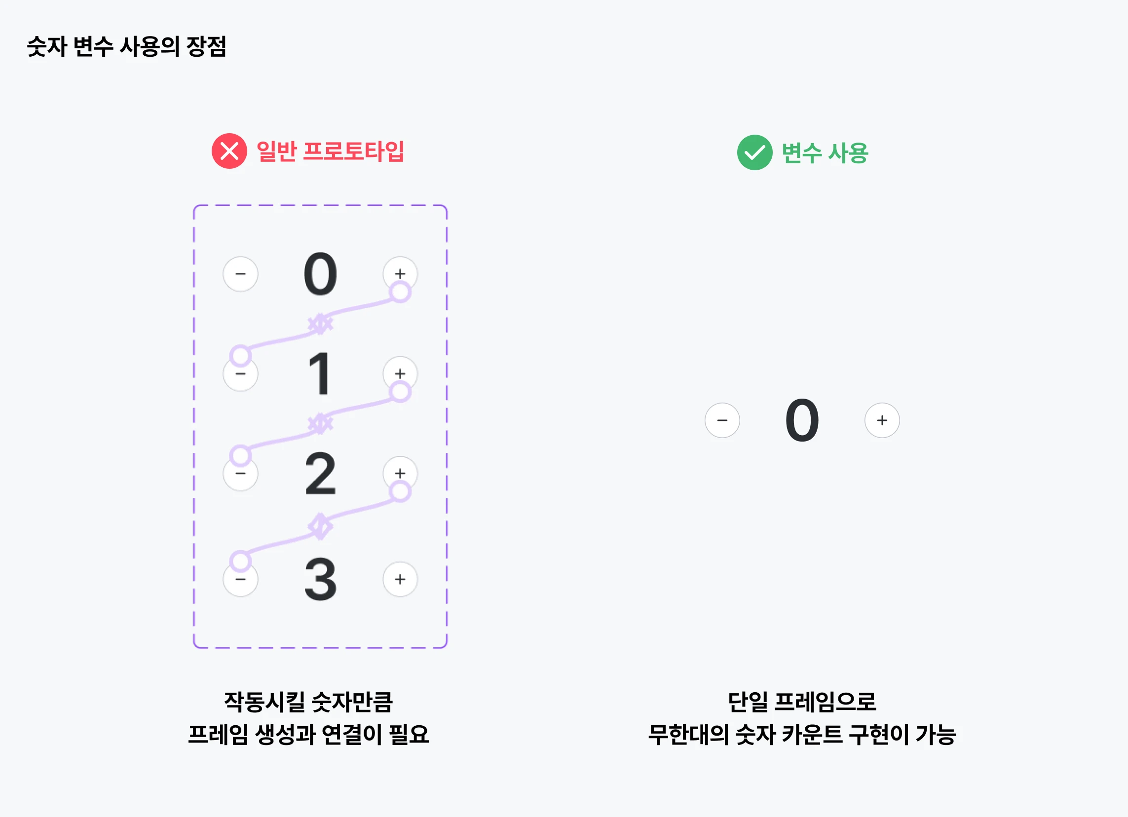 기존에는 제품 선택 시 장바구니 숫자를 카운트하기 위해선 숫자별로 모든 시나리오의 화면을 하나씩 다 만든 다음에 각기 연결하는 방법을 사용했다. 이제는 연관된 컴포넌트에 Boolean값과 Number를 사용하여 장바구니 프로토타입을 손쉽게 구현하는 방법을 소개한다.