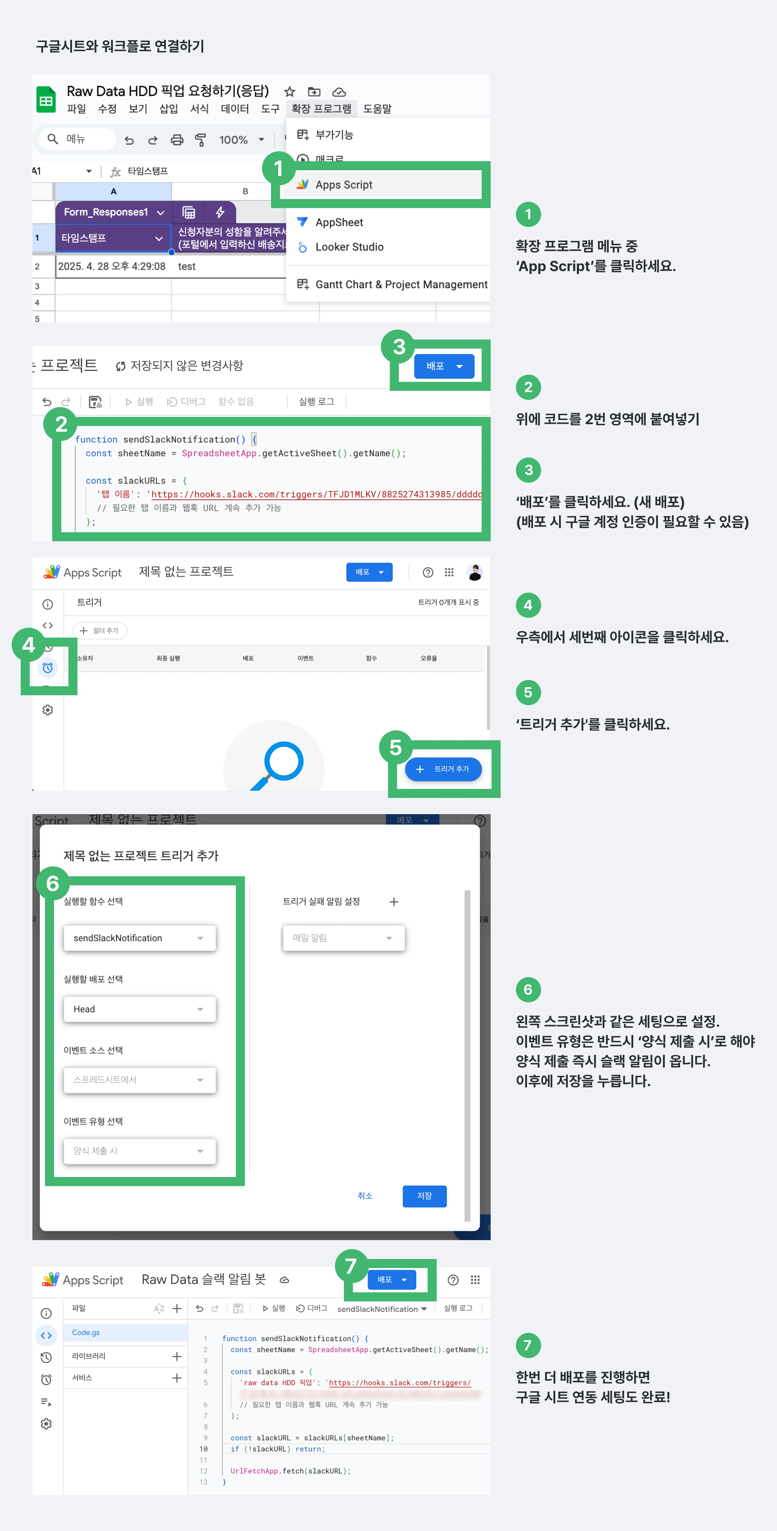 하지만 이런 개선에는 추가적인 부작용이 하나 따라왔다. 고객이 기다리지 않도록 빠르게 픽업을 보내드려야하니 CX팀은 하루에도 수십번 제출 시트를 확인하며 매번 새 픽업 요청이 왔는지 확인해야 했었다. 즉 응답이 제출되는 순간 바로 인지해야할 필요가 있었다. 마침 CX팀은 우리와 같은 팀이라 바로 옆자리에 앉아계셨고 (우리는 세일즈, CX, 마케팅, 디자인이 같은 팀이다) 옆에서 일하는걸 보면서 해당 문제를 빠르게 인지할 수 있었다. 구글폼에 제출 시 이메일 알림이 오는 기능은 있었지만 이메일은 안됐다. 그것보단 내가 태그되어 알림음이 오고, 채널에 검색도 쉽고, 이모지 등으로 확인했는지 체크도 쉬운 슬랙으로 알림이 와야만 했다. 찾아보니 Zapier와 같은 자동화 툴도 있지만 무료로는 사용량이 제한되어 있다. 그래서 챗지피티에게 물어봐가며 아래와 같이 구현을 했다.