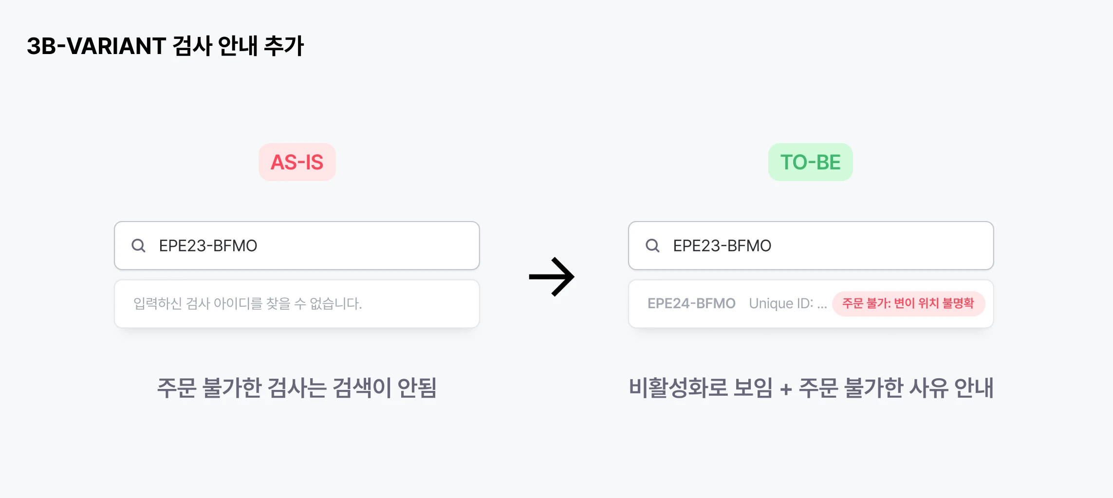 3B-VARIANT가 바로 이 Sanger Sequencing 기법을 사용하는 검사이다. WES, WGS로 확인된 변이를 컨펌하는 과정에서 활발히 사용되고 있다. 원래는 3B-VARIANT 주문 불가 변이에 대해 안내하지 않았는데, 이에 해당하는 고객들이 종종 왜 Sanger가 안되냐고 문의하기도 했다. 이걸 ui에 안내하여 문의를 줄이기도 하였음.