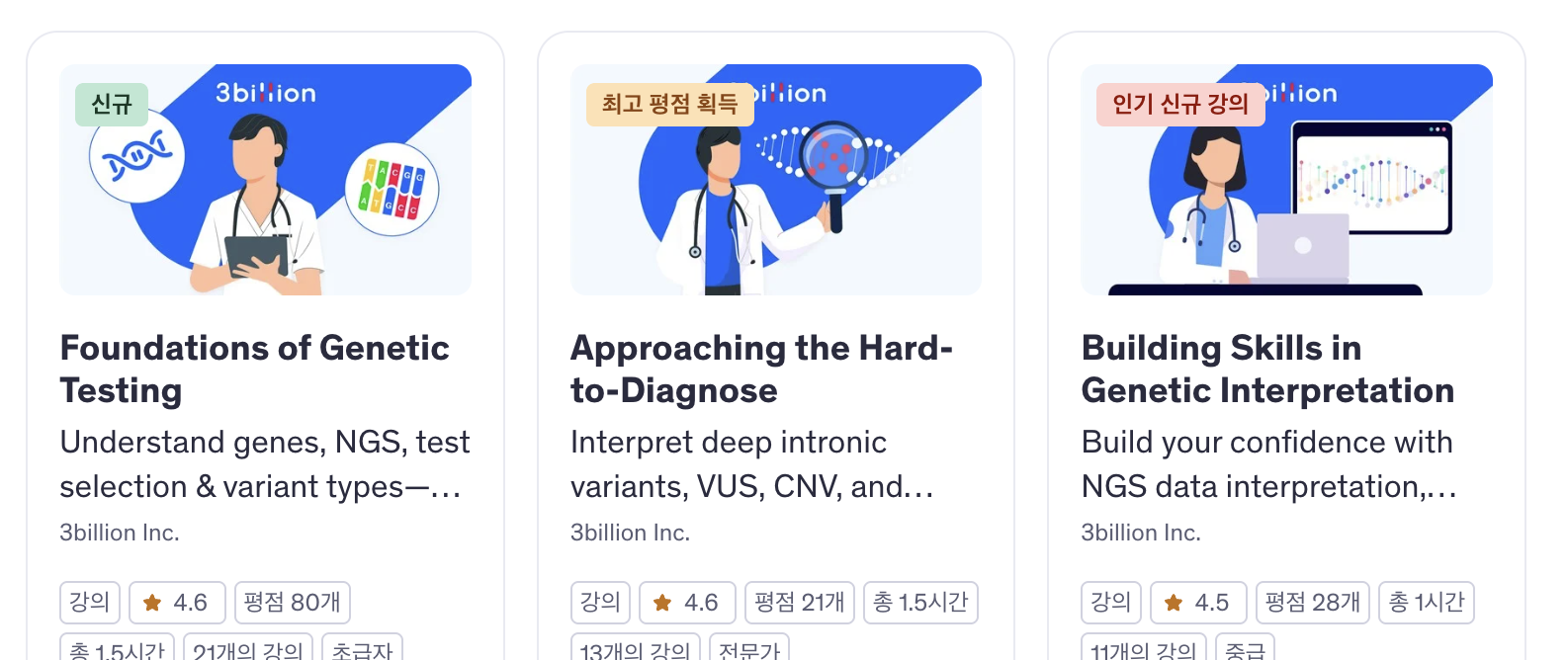그럼 우리는 어떤 컨텐츠를 만들어야 고객에게 도움이 될 수 있을까? 접근성을 높일 수 있는 기본적인 유전학 지식도 제공하고, 쓰리빌리언 검사는 어떻게 분석이 되고 검사 결과는 어떻게 해석해야하는지를 전문가들이 알려준다면 지식적인 측면에서 도움도 되고 검사의 유용성을 좀 더 느낄 수 있지 않을까? 라는 생각으로 마케팅팀에서 야심차게 준비한 Udemy 강의가 있다. 이 프로젝트는 마케팅팀이 기획하고, 내부 임상유전학팀이 본인들의 전문성을 100% 활용하여 제작하였으며, 디자인팀은 컨텐츠 제작에 보조적인 도움을 드렸다.