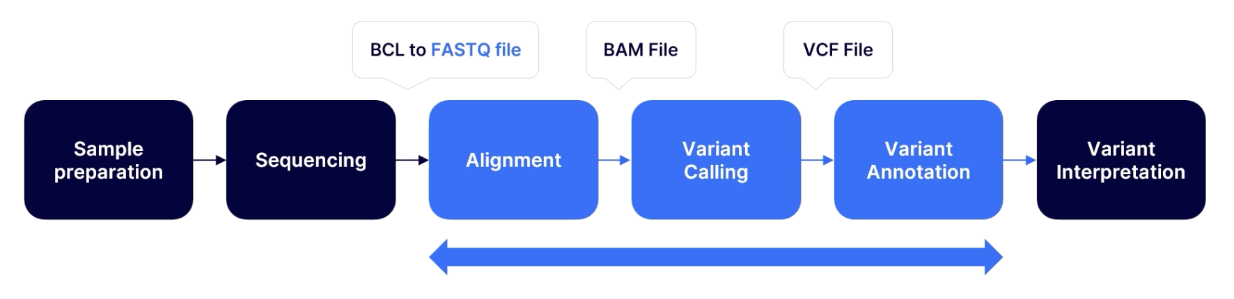 출처: 강의 자료 BCL 파일은 리드 정보가 포함된 FASTQ로 변환된다. 이걸 reference genome과 정렬시켜 BAM 파일로 저장. 그 다음 variant calling을 통해 VCF 파일로 변환된다.