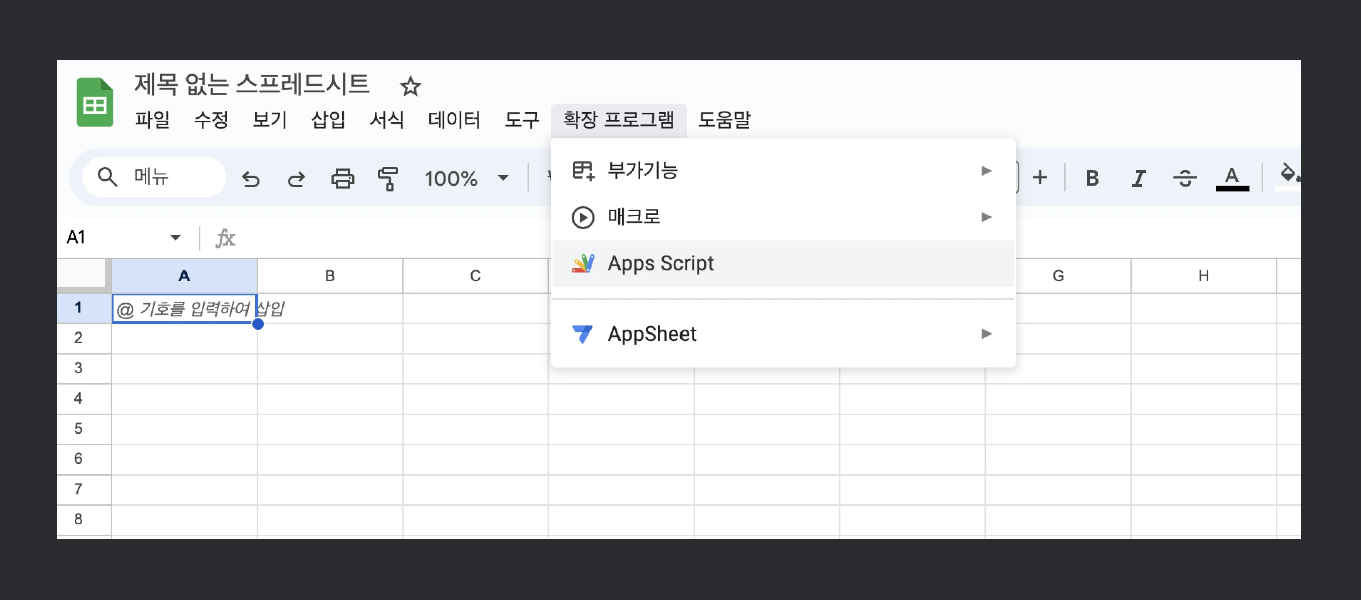 4. 구글 Apps Script를 연다. (상단바 확장 프로그램에서 선택, 없으면 부가기능에서 설치하면 됩니다!)