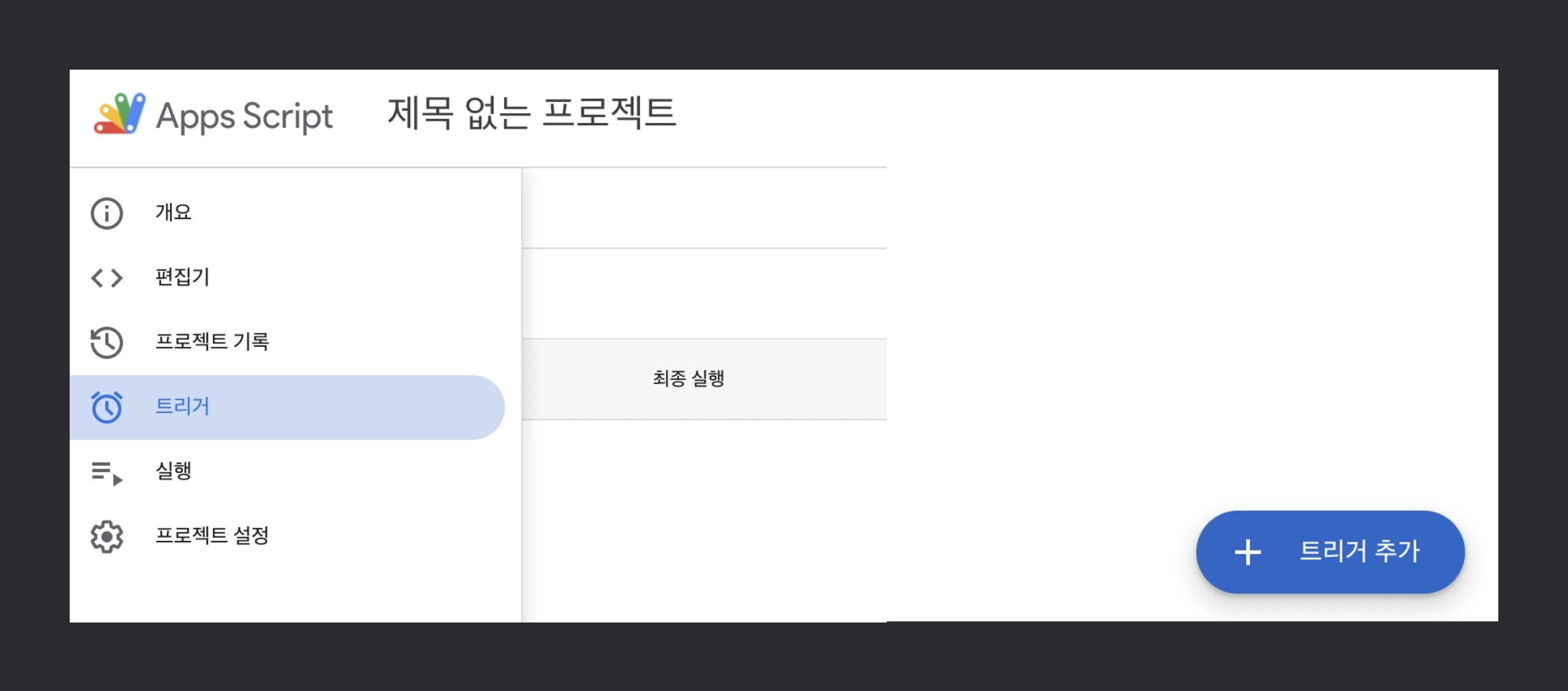 처음에 appscrpits가 아니라 google Colab에서 파이썬으로 구현했는데 Colab은 브라우저가 띄워져있을때만 런이 돌아간다고 했다. 그래서 백그라운드에서도 작업이 돌아가도록 시트에 데이터를 쌓고 쌓인게 5분마다 웹훅으로 호출되도록 방식을 변경함.