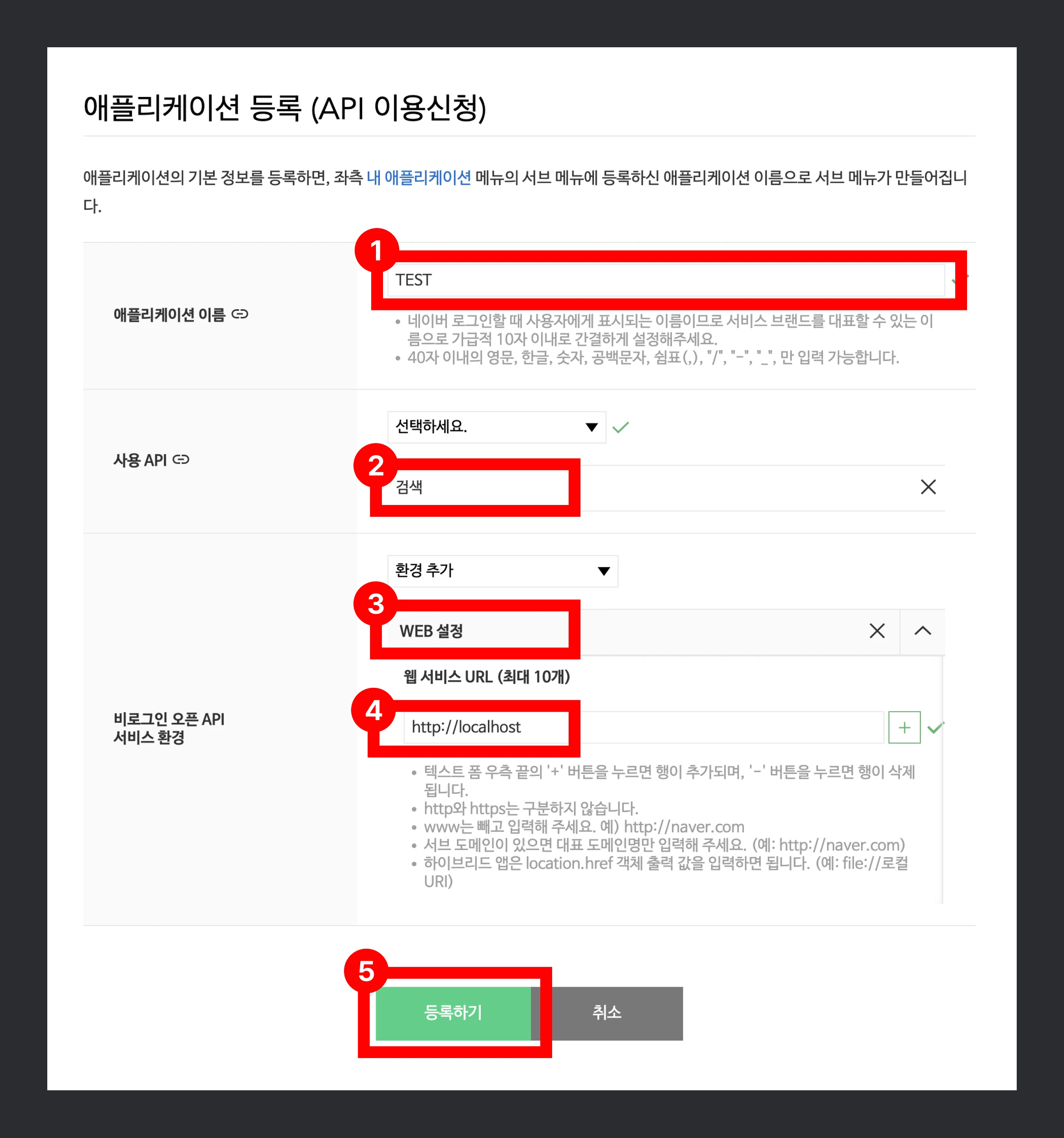 등록 신청을 한다. 이름 설정하고, 검색 선택, Web 설정 선택, URL은 http://localhost로 기입 후 등록하기 버튼 누르기