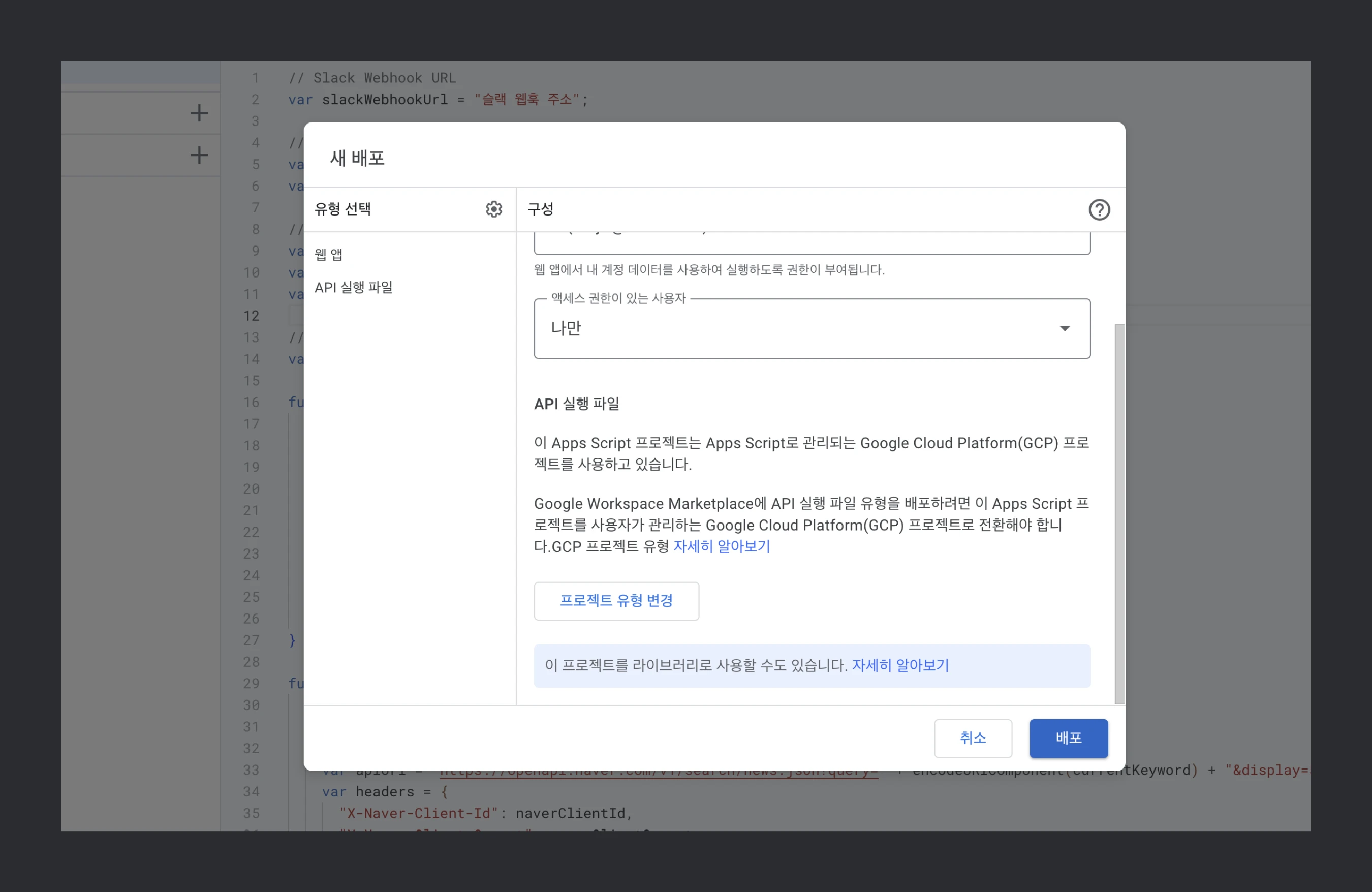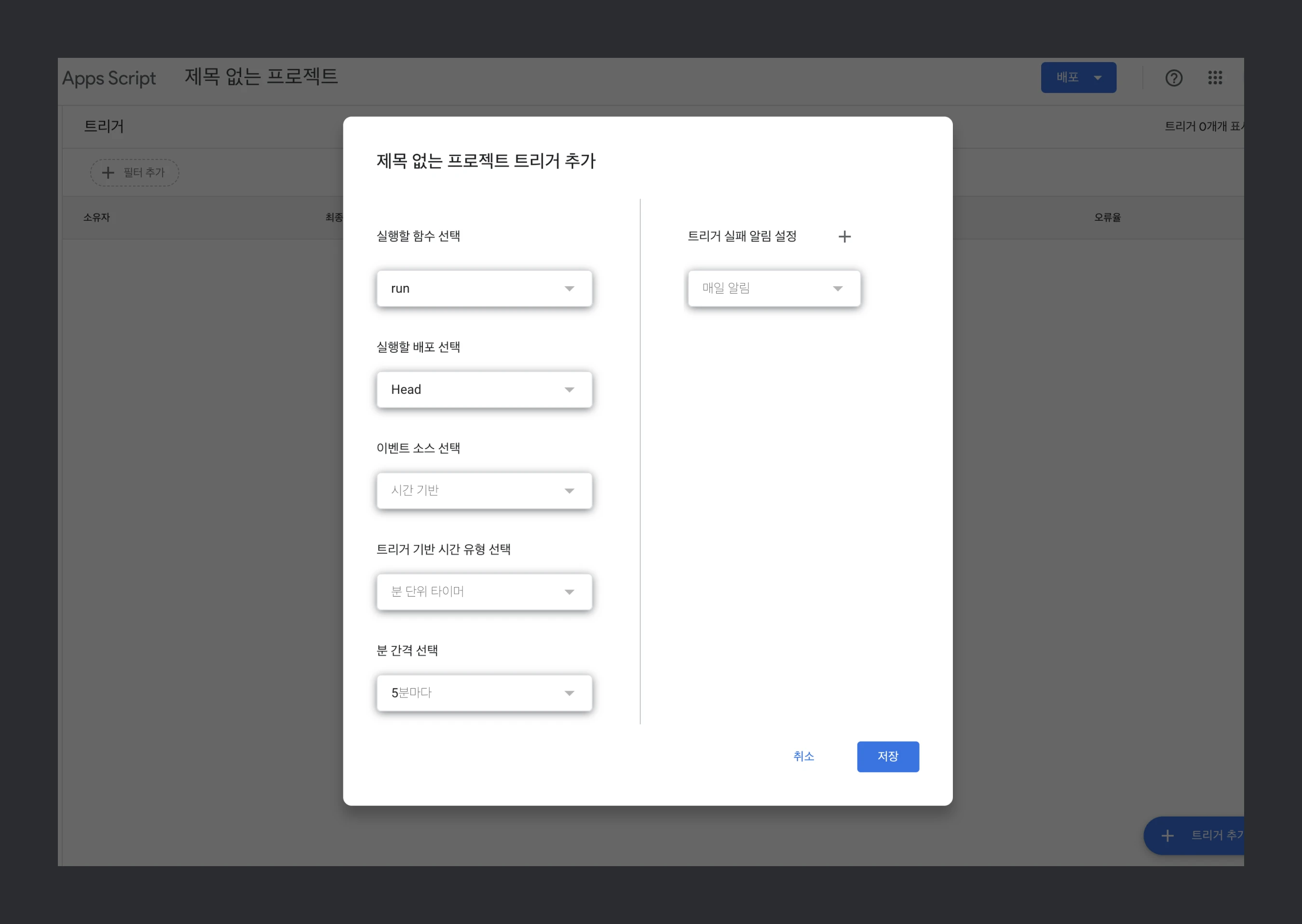 함수는 run 선택, 소스는 시간 기반으로 원하는 분으로 선택 (나는 코드도 5분이라 5분 단위로 선택했다) 8. 코드를 배포한다. (배포 유형은 웹앱)