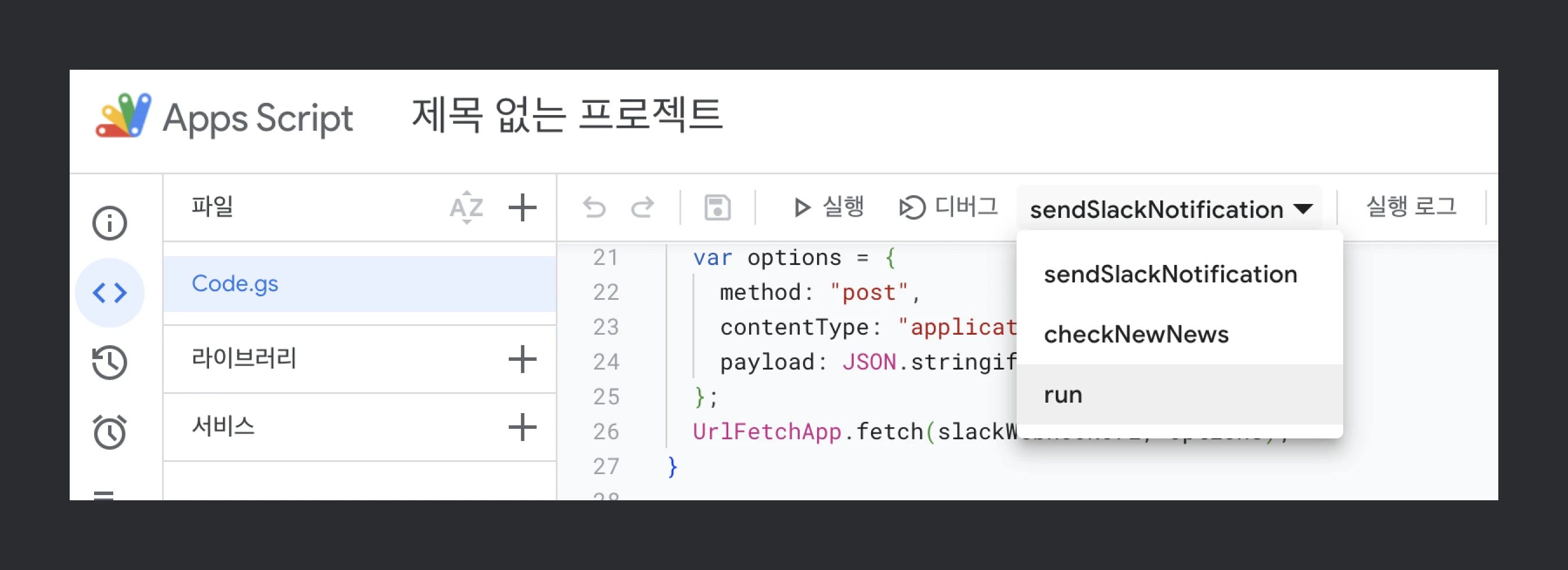 // Slack Webhook URL var slackWebhookUrl = "슬랙 웹훅 주소"; // Google Sheets 스프레드시트 정보 설정 var spreadsheetId = "시트 고유 주소"; var sheetName = "시트 탭 이름"; // 네이버 API 설정 var naverClientId = "네이버 API ID"; var naverClientSecret = "네이버 API Secret"; var naverKeywords = ["키워드1", "키워드2", "키워드3"]; // 여러 키워드를 배열로 저장 // 이전에 처리한 뉴스의 제목을 저장하는 프로퍼티 키 var processedNewsTitleKey = "processedNewsTitle"; function sendSlackNotification(title, link) { // 슬랙으로 알림 보내기 var slackMessage = { text: "제목: " + title + "\n링크: " + link }; var options = { method: "post", contentType: "application/json", payload: JSON.stringify(slackMessage) }; UrlFetchApp.fetch(slackWebhookUrl, options); } function checkNewNews() { // 여러 키워드로 뉴스 검색 for (var k = 0; k < naverKeywords.length; k++) { var currentKeyword = naverKeywords[k]; var apiUrl = "https://openapi.naver.com/v1/search/news.json?query=" + encodeURIComponent(currentKeyword) + "&display=5&dsc=1"; var headers = { "X-Naver-Client-Id": naverClientId, "X-Naver-Client-Secret": naverClientSecret }; var response = UrlFetchApp.fetch(apiUrl, { headers: headers }); var result = JSON.parse(response.getContentText()); // 이전에 처리한 뉴스의 제목과 URL 가져오기 var processedNewsData = PropertiesService.getUserProperties().getProperty(processedNewsTitleKey); processedNewsData = processedNewsData ? JSON.parse(processedNewsData) : []; // 새로운 뉴스가 있으면 처리 for (var i = 0; i < result.items.length; i++) { var newsTitle = result.items[i].title; var newsLink = result.items[i].link; // 이미 처리한 뉴스인지 및 중복된 URL인지 확인 if (processedNewsData.some(news => news.title === newsTitle && news.link === newsLink)) { continue; // 이미 처리한 뉴스면 건너뜀 } // 중복 URL이 시트에 등록되어 있는지 확인 var sheet = SpreadsheetApp.openById(spreadsheetId).getSheetByName(sheetName); var lastRow = sheet.getLastRow(); var urls = sheet.getRange(1, 2, lastRow, 1).getValues().flat(); // assuming URLs are in column B if (urls.includes(newsLink)) { continue; // 중복 URL이면 건너뜀 } // Google Sheets 스프레드시트에 기록 sheet.appendRow([newsTitle, newsLink]); // 슬랙으로 알림 보내기 sendSlackNotification(newsTitle, newsLink); // 처리한 뉴스의 제목과 URL 저장 processedNewsData.push({ title: newsTitle, link: newsLink }); } // 프로퍼티에 저장 PropertiesService.getUserProperties().setProperty(processedNewsTitleKey, JSON.stringify(processedNewsData)); } } // 5분 간격으로 실행 function run() { checkNewNews(); Utilities.sleep(5 * 60 * 1000); run(); }6. 코드 중 아래 빨간 글씨 부분만 수정한다.