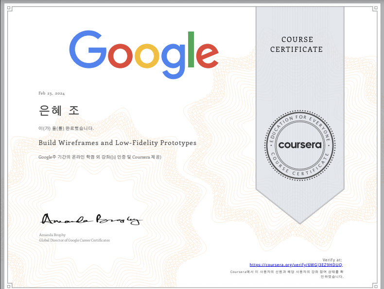 Google UX Design - 전문 인증서의 세번째 코스인 Build Wireframes and Low-Fidelity Prototypes을 수료했다.