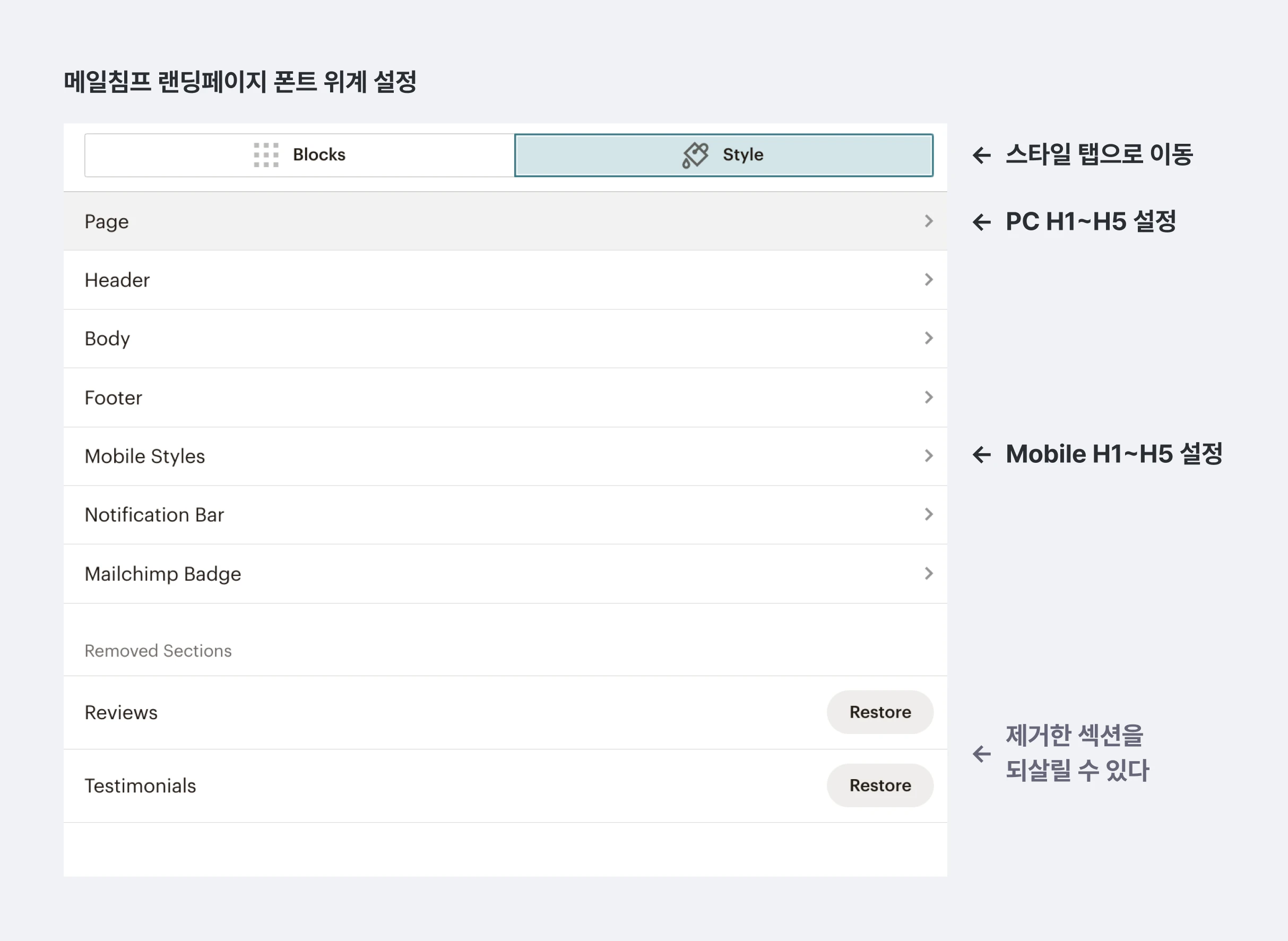 메일침프에선 기본적으로 PC/Mobile의 h1-4 및 섹션별 본문 font Size/Weight/line-height을 모두 따로 설정할 수 있다.