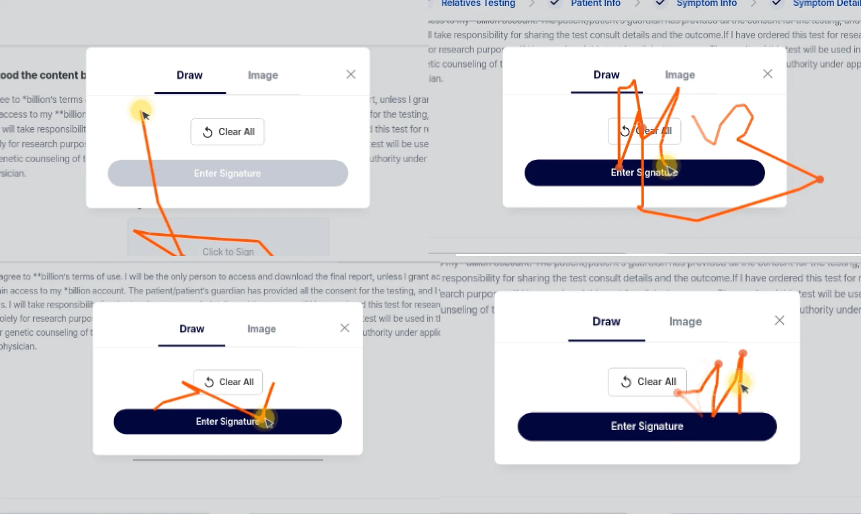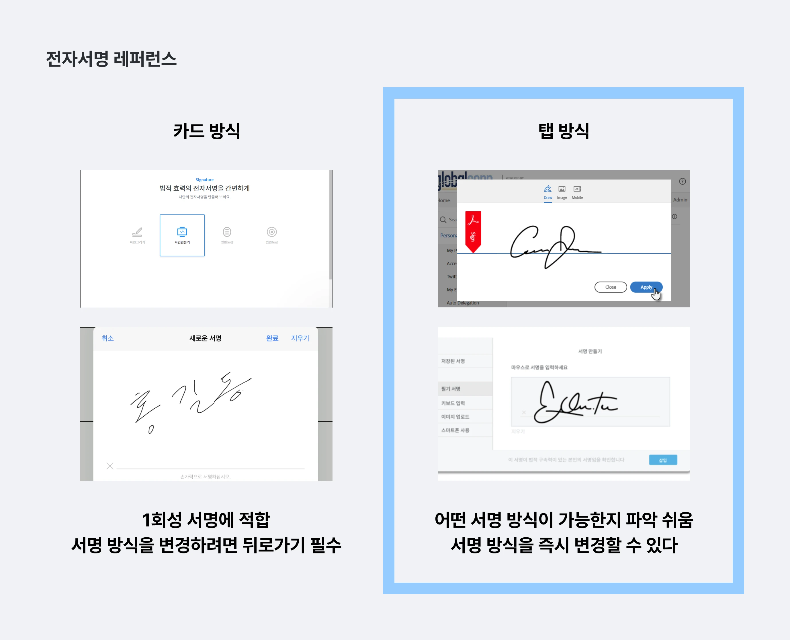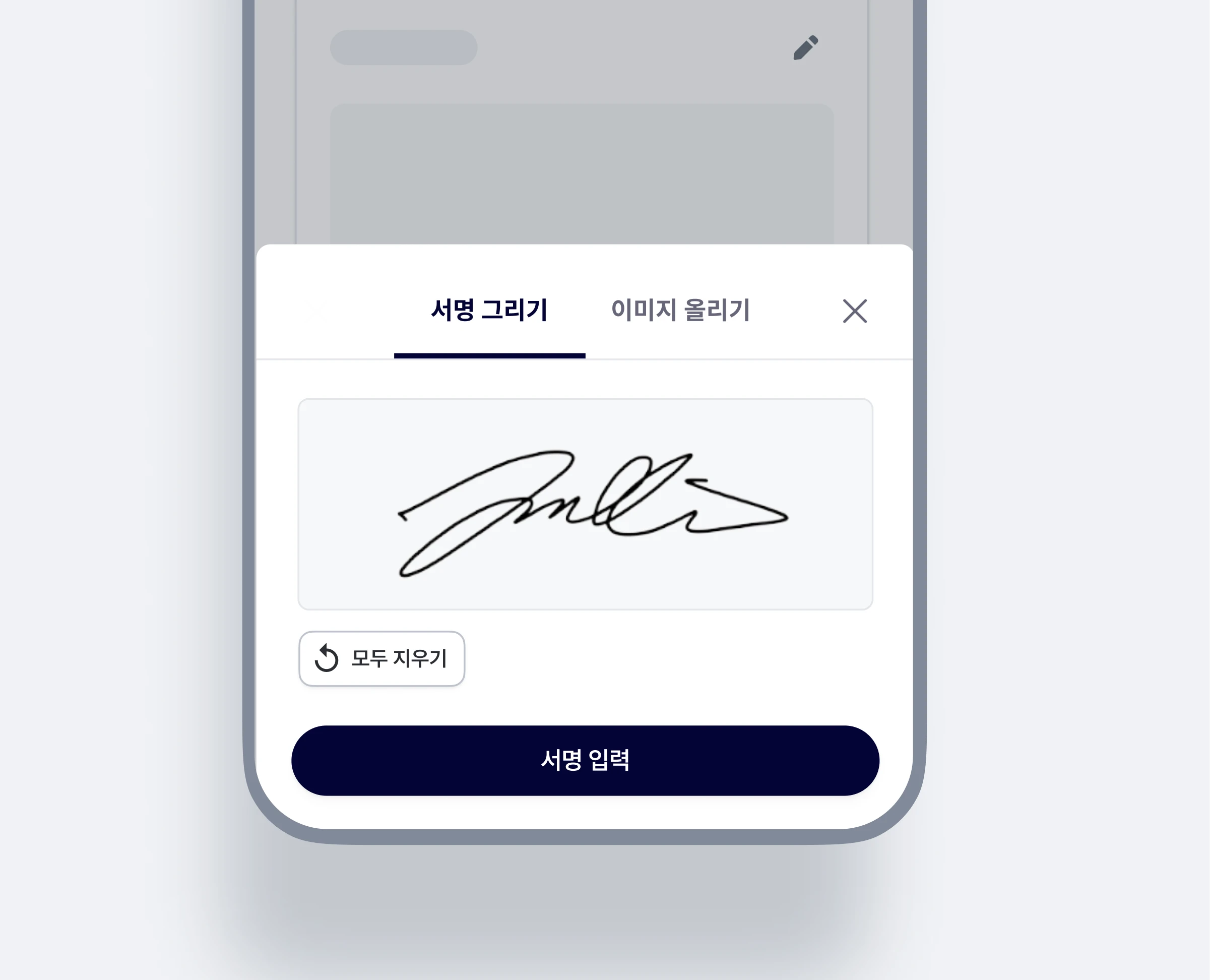 불필요한 요소는 전부 제거하고, 이미지를 준비하는 번거로움보다 마우스/손으로 바로 그리는게 편할 것이란 가설로 '서명 그리기' 가 먼저 노출되도록 하였다.